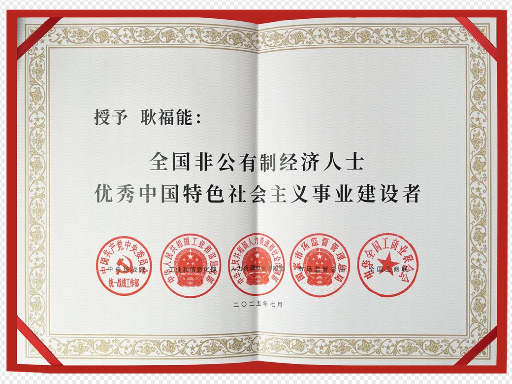 本次评选由中央统战部、工信部、人力资源社会保障部、市场监管总局和全国工商联联合开展,旨在表彰在推动经济社会发展、促进科技创新、履行社会责任等方面作出突出贡献的非公有制经济人士。此次共评选出100名“优秀建设者”,耿福能董事长作为医药行业代表光荣入选。全国“优秀建设者”评选表彰始于2004年,第二届至第五届评选的时间分别是在2006年、2009年、2014年、2019年。第六届表彰距离上一次评选已经时隔六年。