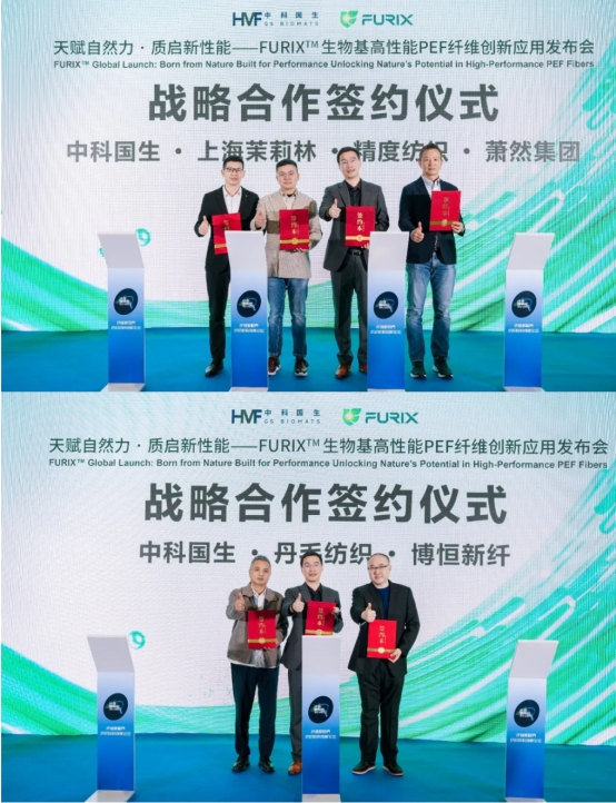 为加速PEF纤维从技术研发阶段向大规模商业化应用的高效转化,推动其快速融入纺织产业链各环节,发布会上,中科国生分别与精度纺织、上海茉莉林、萧然科技,以及丹毛纺织、博恒新纤签署战略合作协议,构建起多方协同、优势互补的创新合作体系。