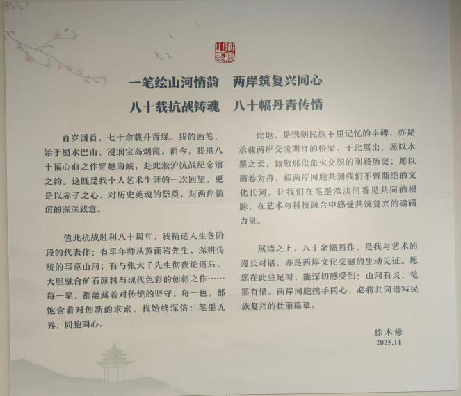 2025年11月27日,“墨韵同源•情系两岸”中国台湾著名画家徐术修画展在上海淞沪抗战纪念馆成功举办。此次画展共展出徐老八十余副作品,精选徐老各阶段的代表作,既是徐老艺术生涯的一次回望;有早年师从黄雨岩先生、传统的写意山河;有与张大千先生彻夜论道后,大胆融合矿石颜料与现代色彩的创新之作;八十余副画作,更是以赤子之心,对两岸情谊的深深致意,亦是两岸文化交融的生动见证。画展期间来自各界人士以及书画爱好者的展览参观,并受到一致好评。